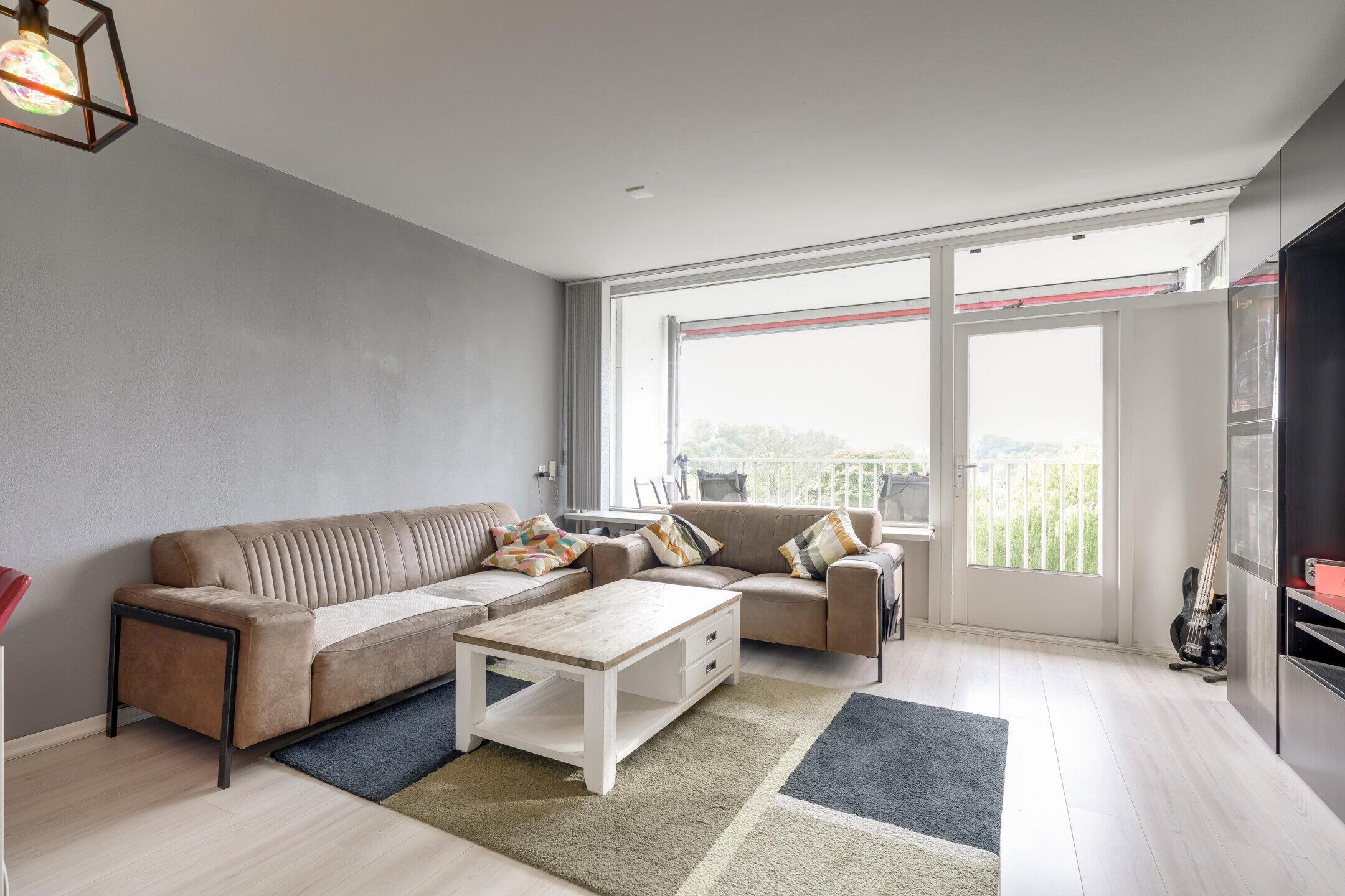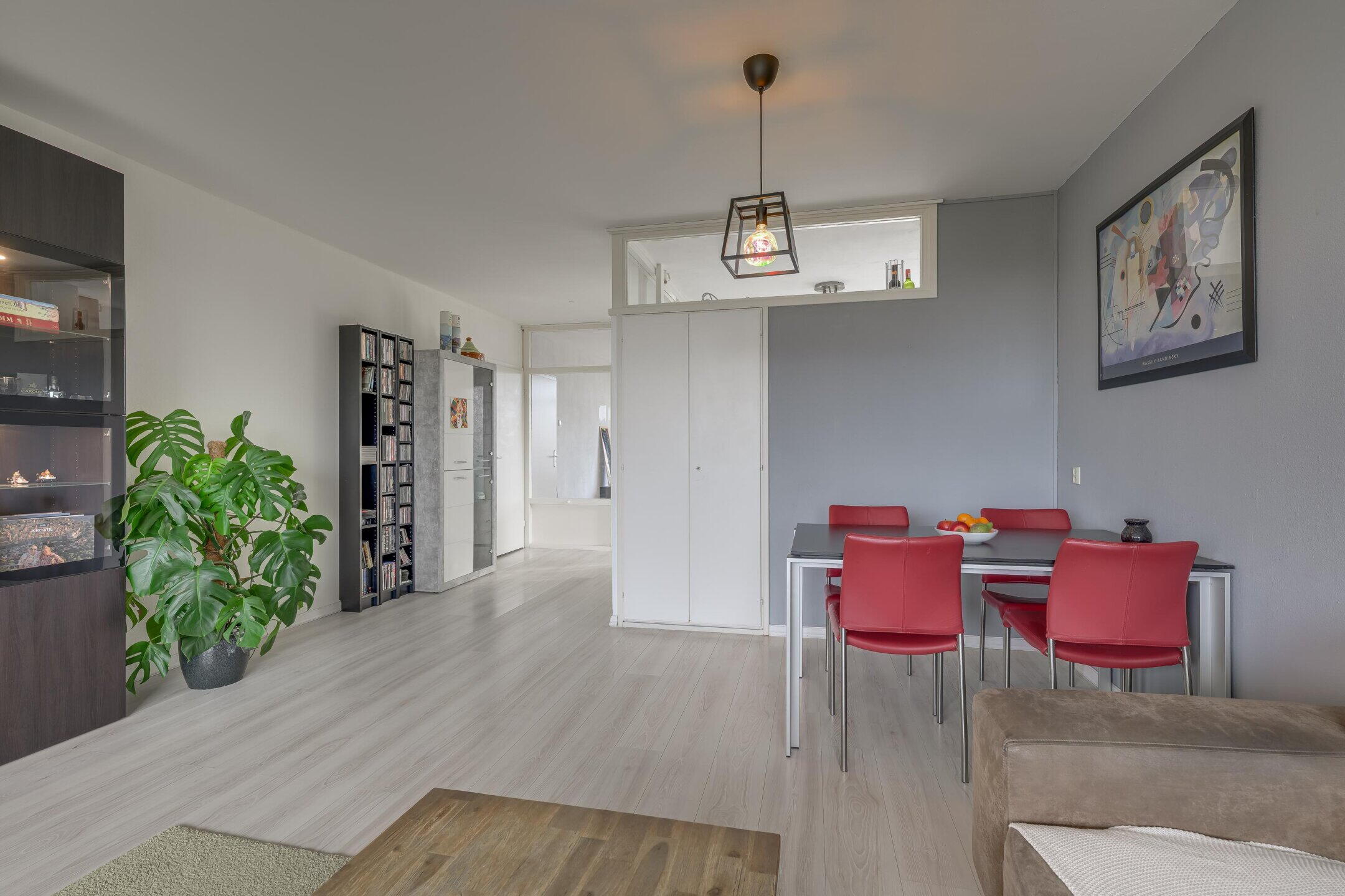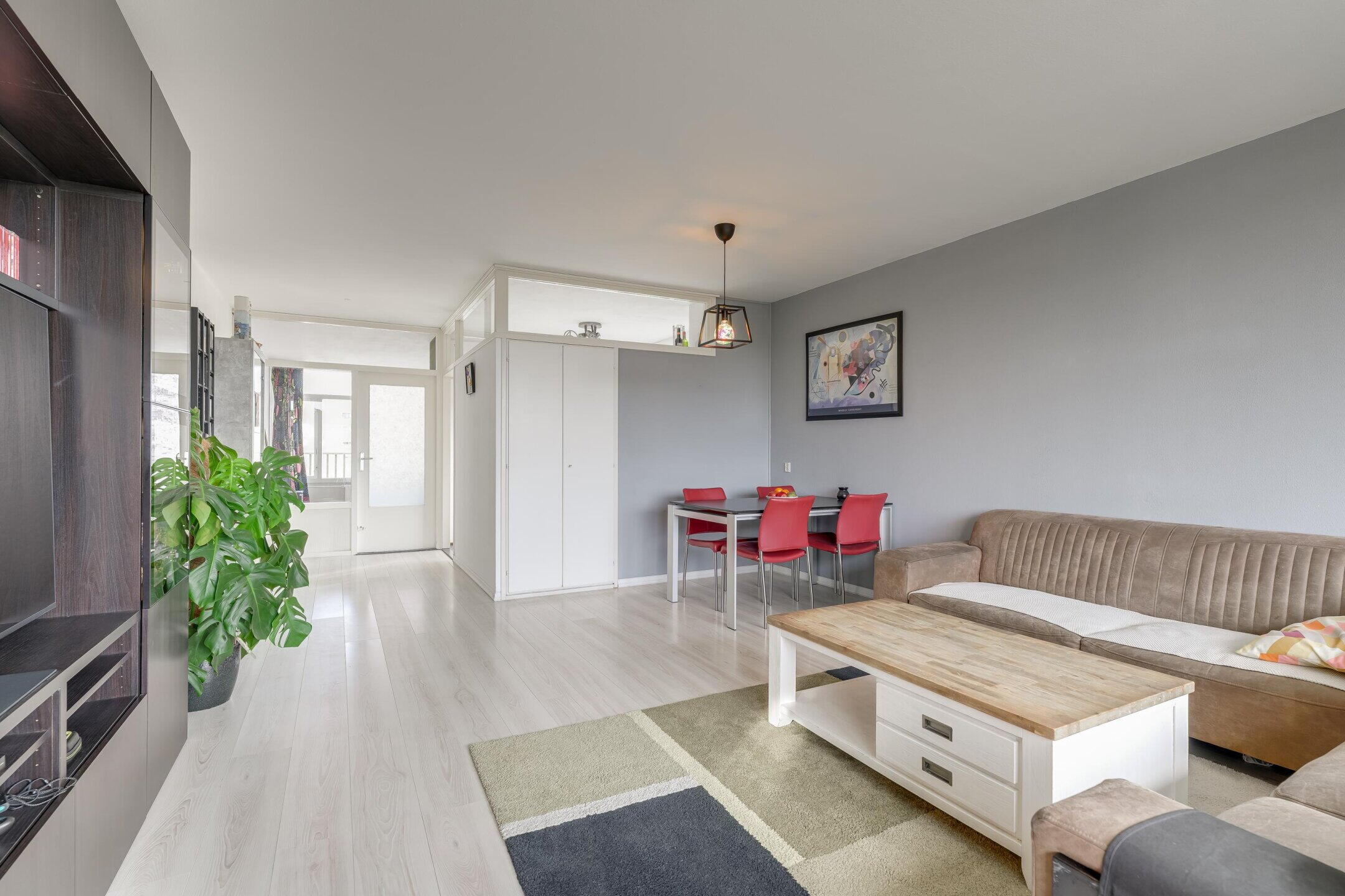 De woonkamer is licht en ruim van formaat en biedt voldoende ruimte voor zowel een zit- als eethoek. Door de grote ramen is er een aangename hoeveelheid lichtinval. Vanuit de woonkamer is het balkon bereikbaar, dat gelegen is op het zuiden.